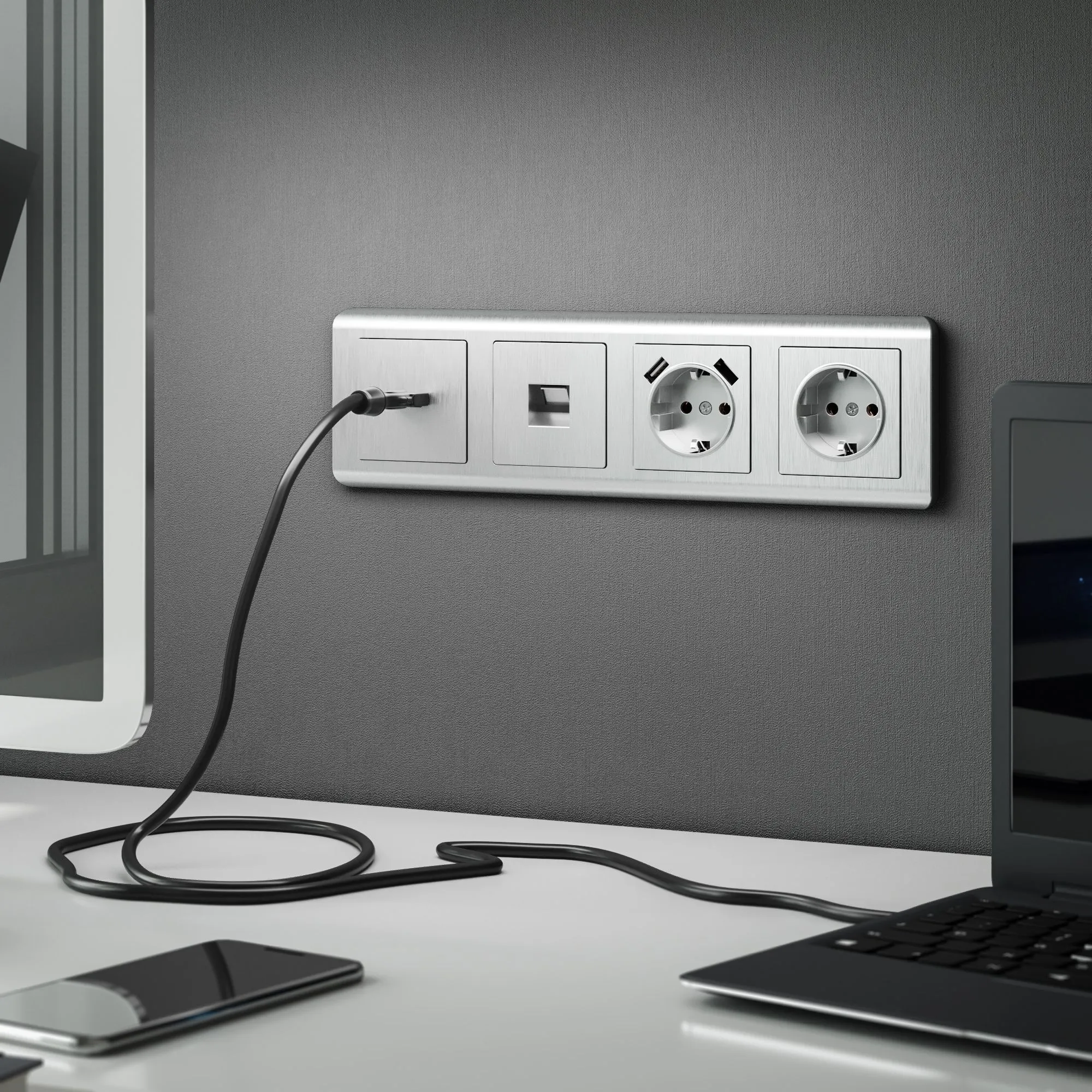 После монтажа остаётся видна только лицевая панель и декоративная рамка, что делает розетку практически незаметной на стене. Благодаря полной совместимости со всеми рамками Werkel, вы легко подберёте цвет и стиль под любой интерьер — от классического до ультрасовременного.
