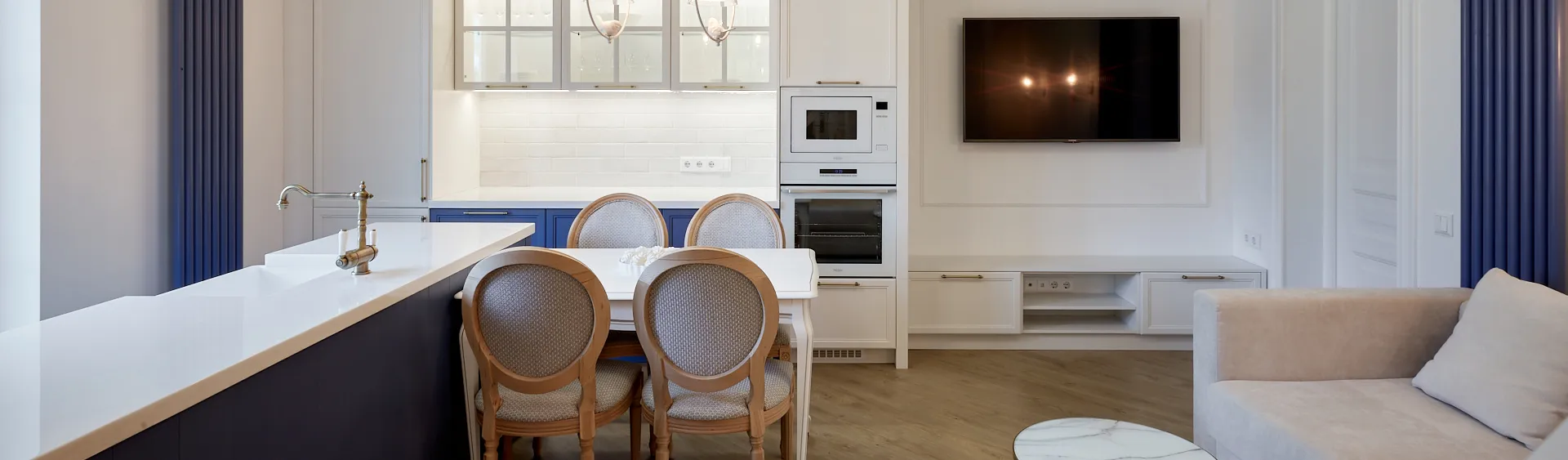 Переделка началась с изменения планировки помещения. Кухню дополнили функциональным полуостровом, на который перенесли мойку. Обеденный стол расположили перпендикулярно полуострову, а границу кухни обозначили линией шкафов в гостиной. Одна из стен стала полностью зеркальной, что позволило увеличить пространство и сделать его ещё светлее. В интерьере нашлось место и для оттенков моря, близких хозяевам дома, добавив помещению свежести и легкости.